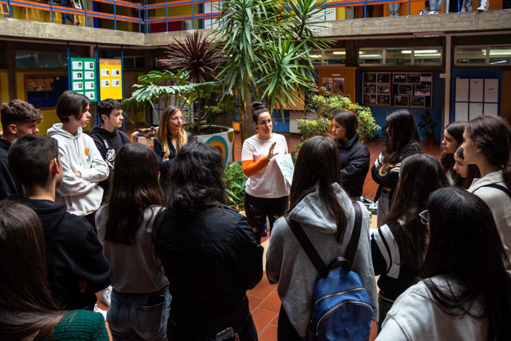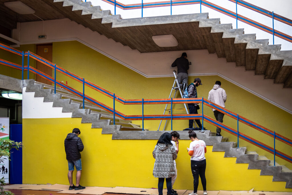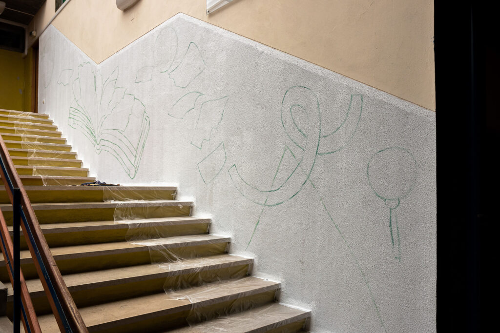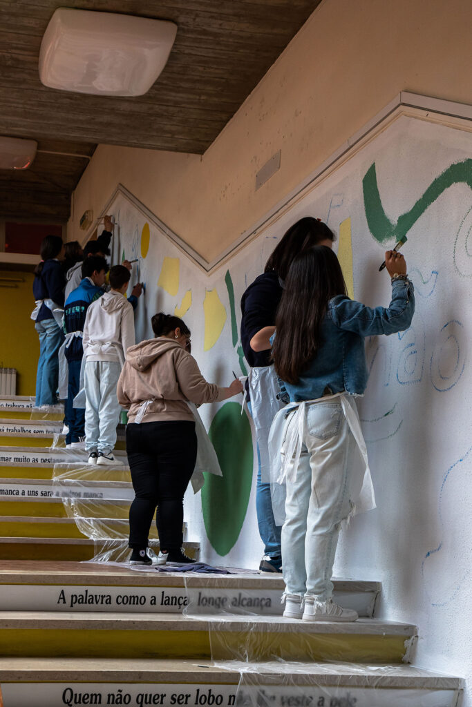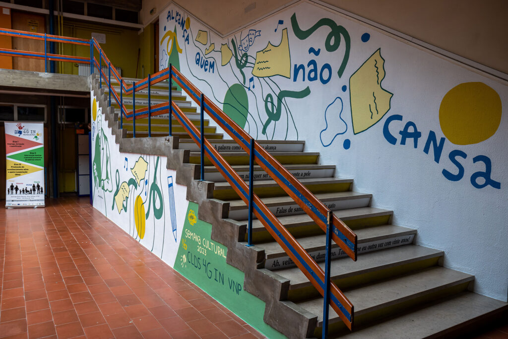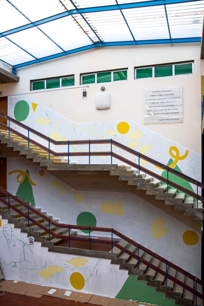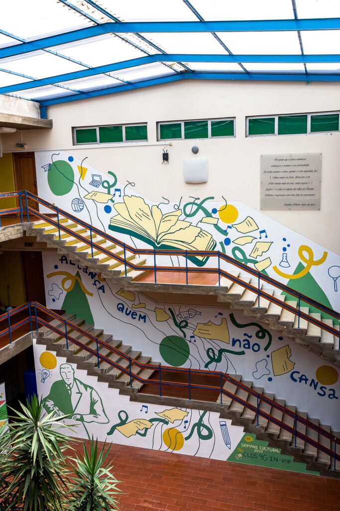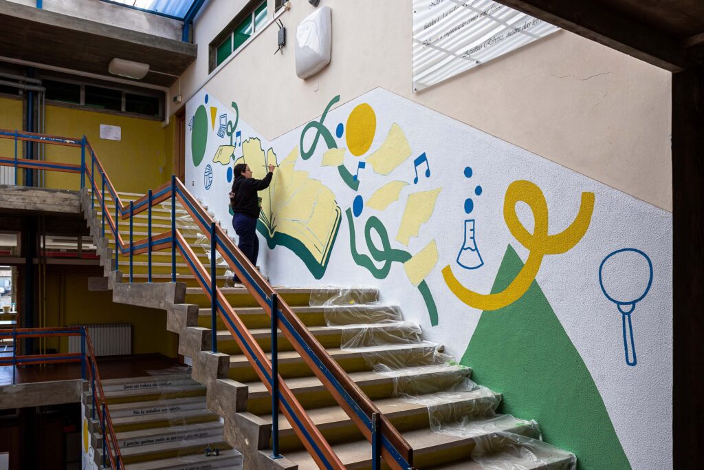 A ideia é estas paredes refletirem o significado da palavra Alcançar: chegar junto, apanhar, agarrar, conseguir, abarcar. Chegamos e alcançamos quando percorremos aos olhares uns dos outros. Estas escadas pretendem deixar em aberto o futuro dos jovens que sobem todos os dias estes degraus e procuram o seu rumo. É através de formas abstratas, linhas, texturas e a imagem de Aquilino Ribeiro que espelhamos a ideia de que sempre “Alcança quem não cansa”!