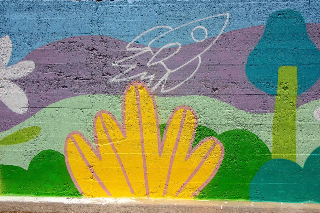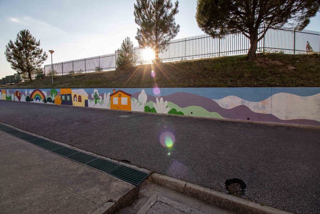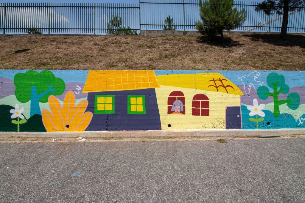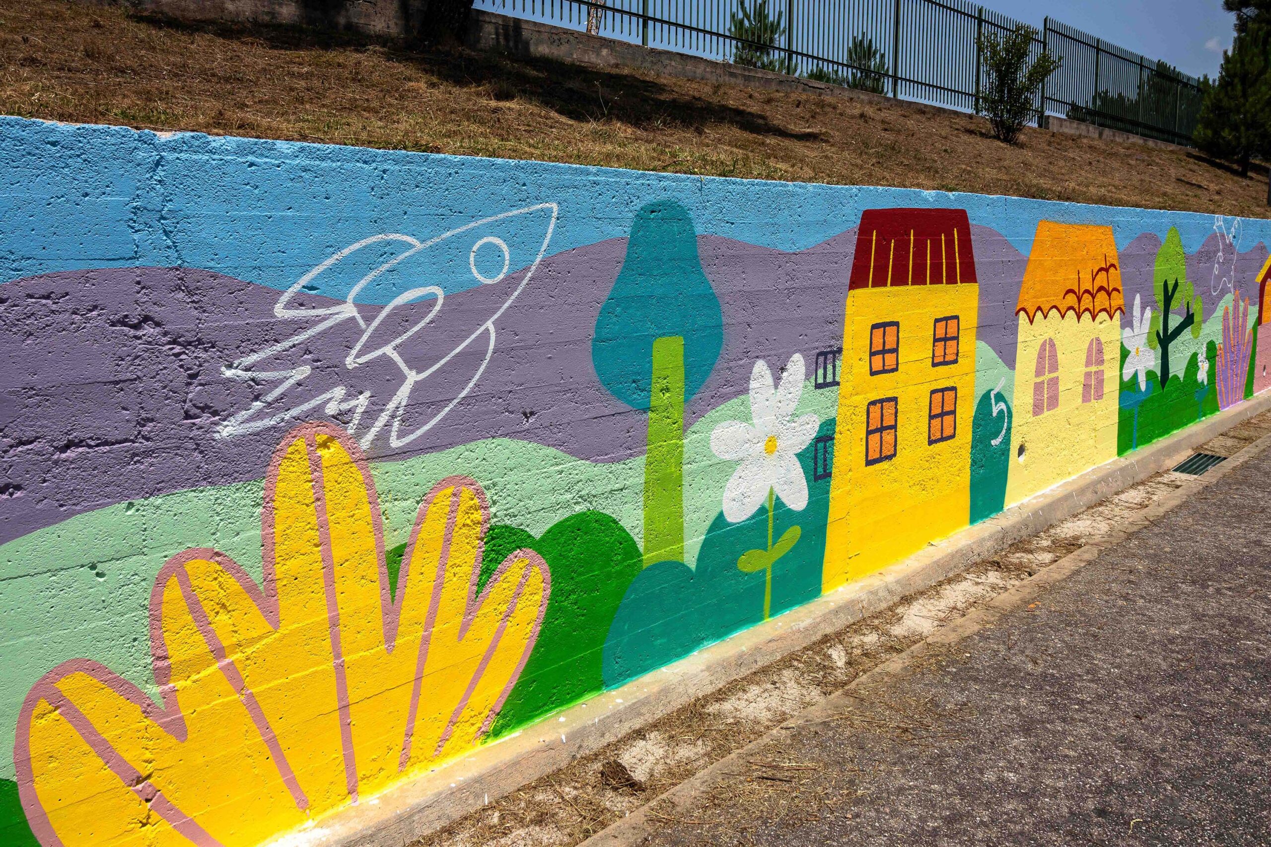 Quantas ideias tem uma criança dentro de si? Quantas histórias, personagens, criações tem uma criança? Nesta pintura temos o desenho de um ambiente calmo e acolhedor como se quer um sítio a que chamamos casa. Um espaço casa e jardim onde podem florescer as ideias e as criações, onde sempre que se olhe se encontra um desenho novo como um pássaro, um balão de ar quente, uma letra, ou até um foguetão! Esta pintura será um ponto colorido que dará vida, inspiração e energia ao espaço escolar.